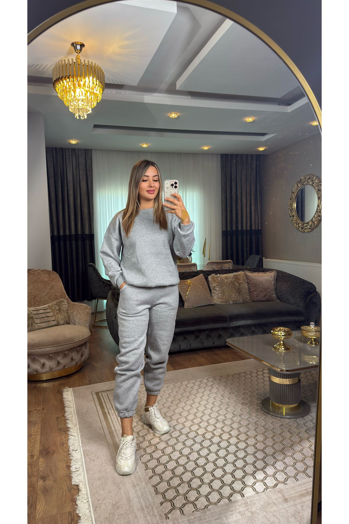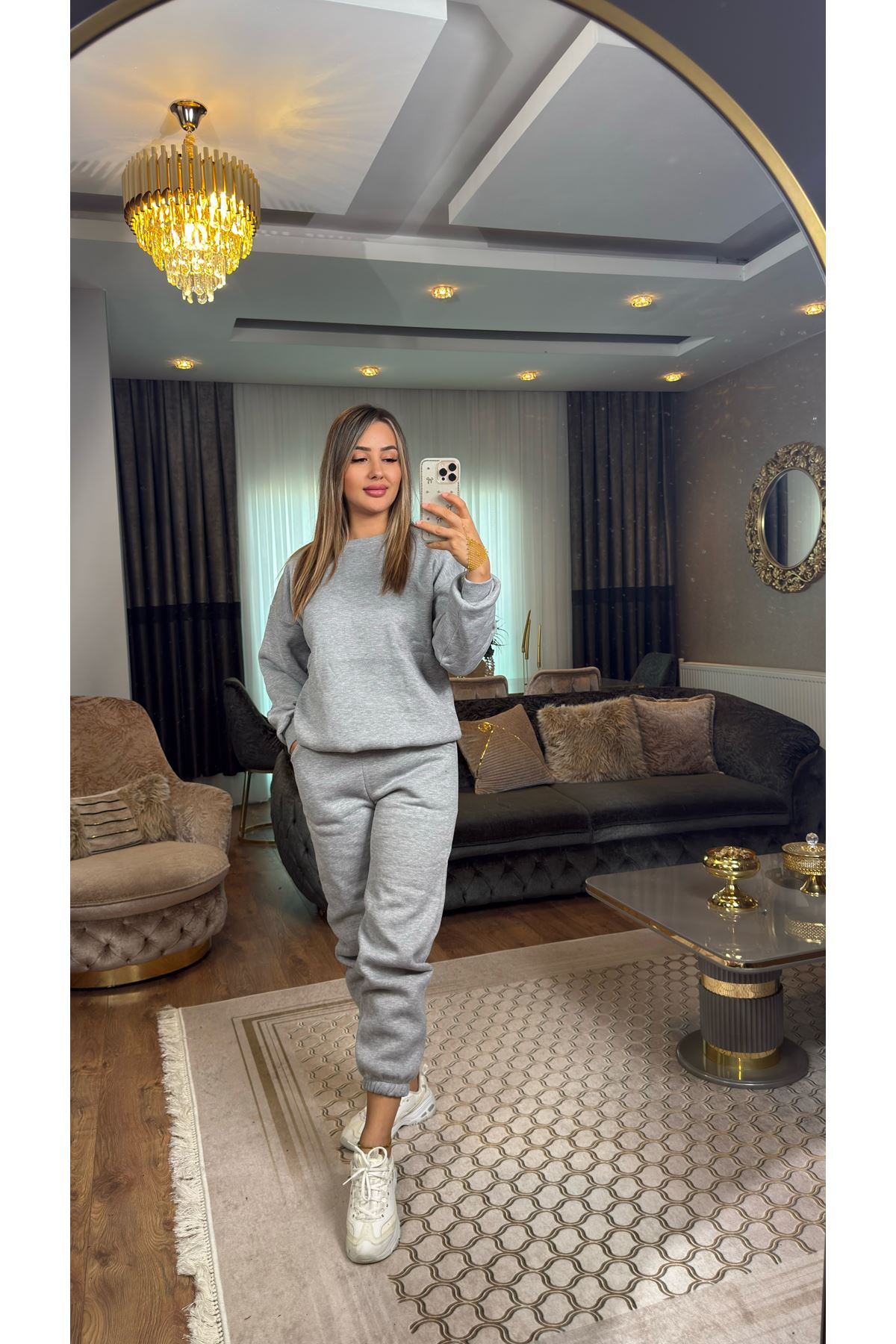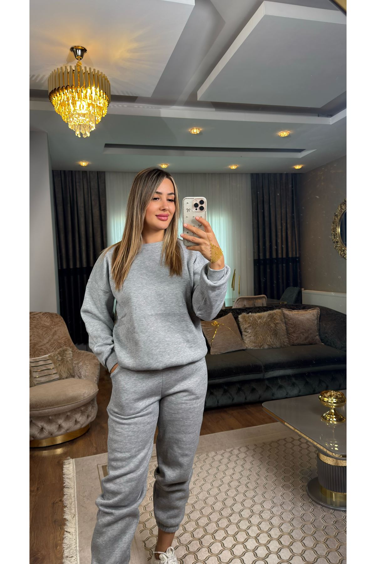 3 İplik Bisiklet Yaka Eşofman Takımı Gri