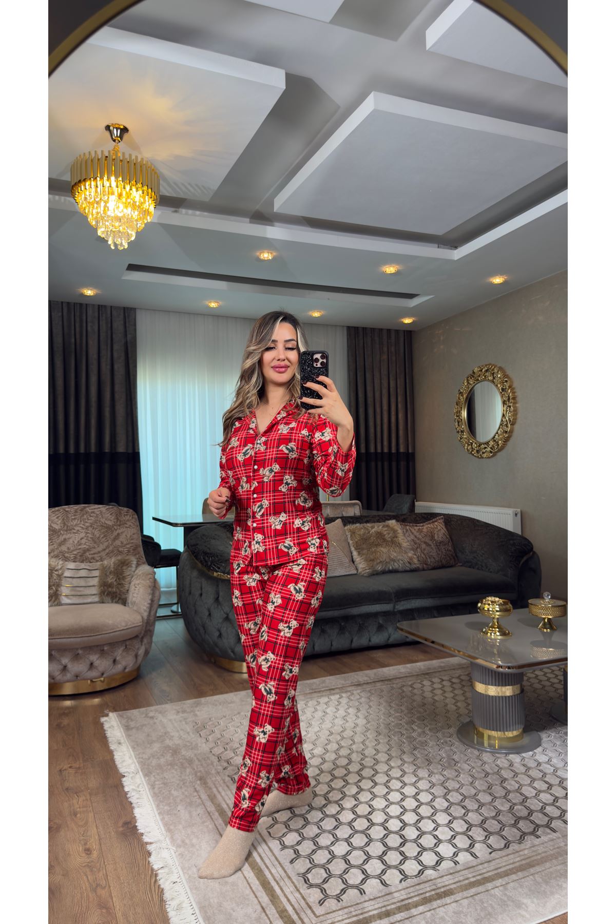 kareli ayıcık desen düğmeli süet pijama takımı-kırmızı