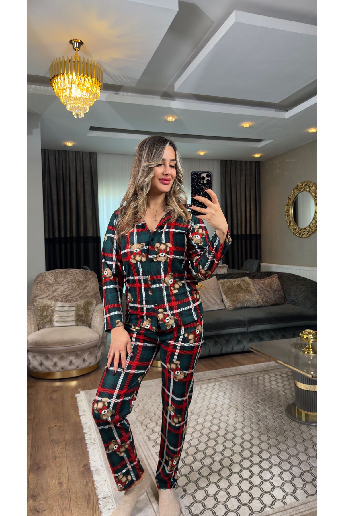 kareli ayıcık desen düğmeli süet pijama takımı-yeşil