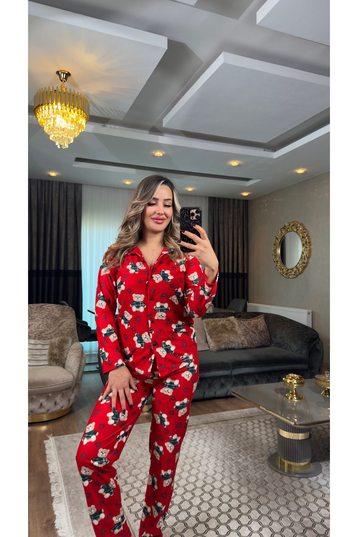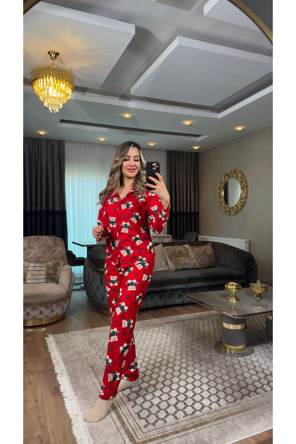 ayıcıklı düğmeli süet pijama takımı-kırmızı
