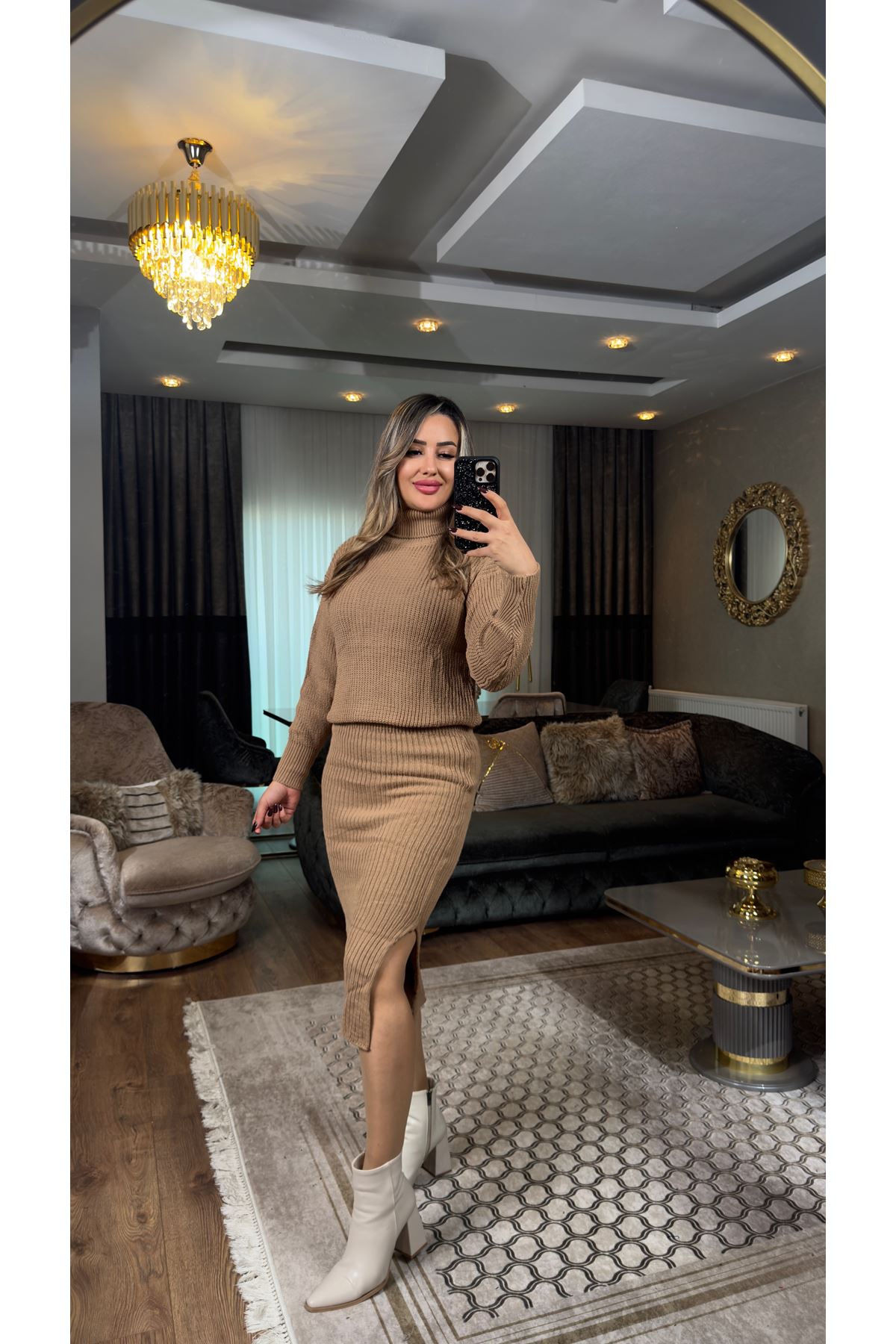 boğazlı triko etekli takım-camel