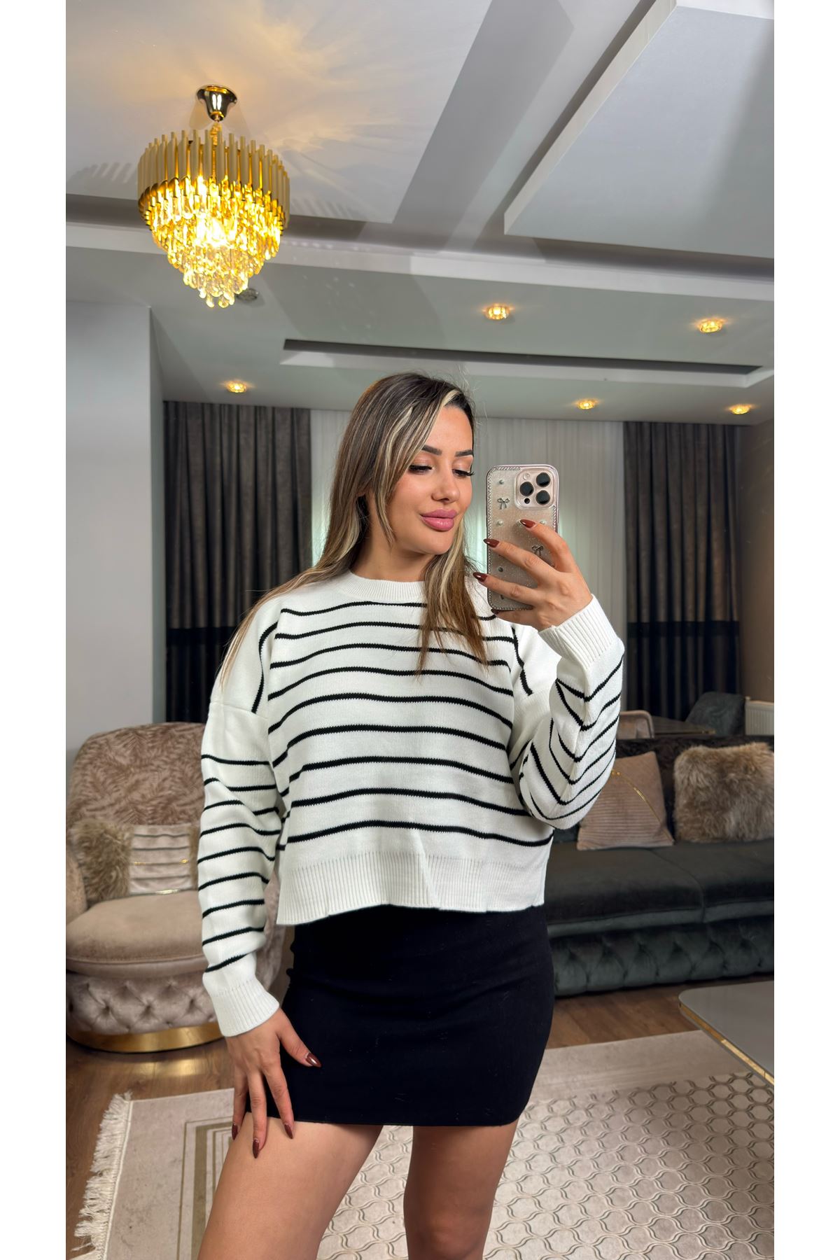 Çizgili Bisiklet Yaka Triko Beyazsiyah