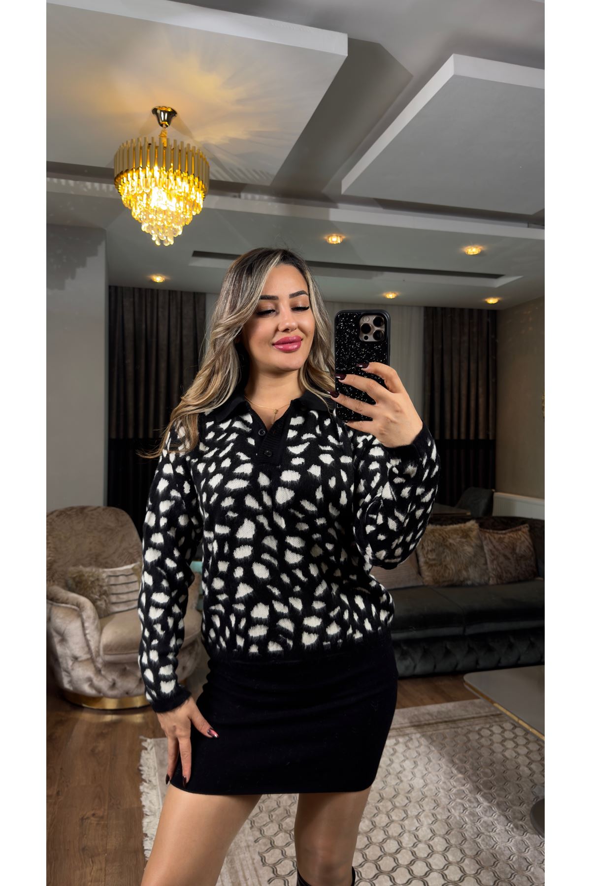 desenli polo yaka düğmeli triko kazak-siyah