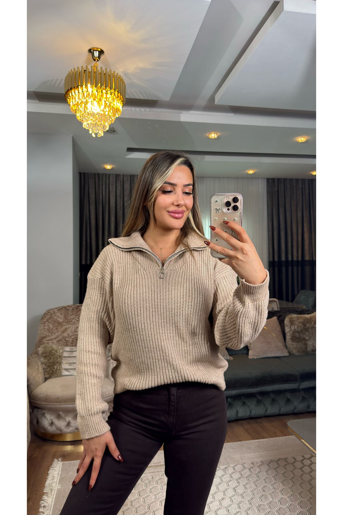 DİLVİN KAPŞONLU SAÇ ÖRGÜ OVERSİZE KAZAK-BEJ