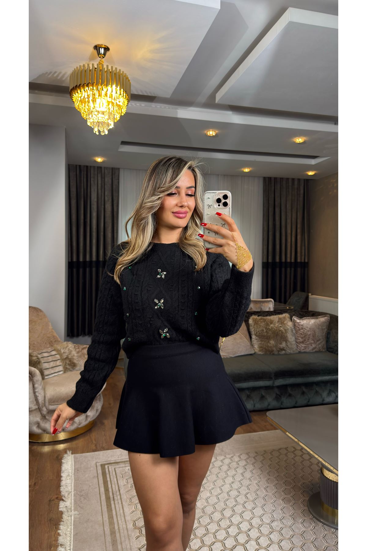 dilvin bisiklet yaka önü taş işlemeli kazak-siyah