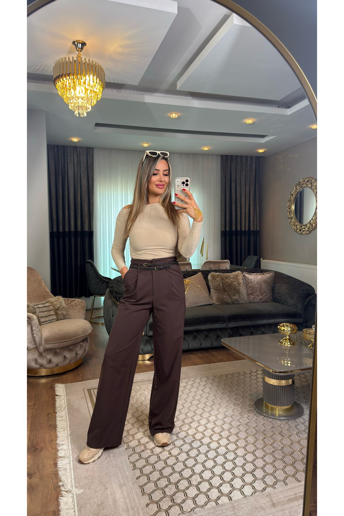 dilvin çift kemerli yüksek bel kumaş pantolon-acıkahve
