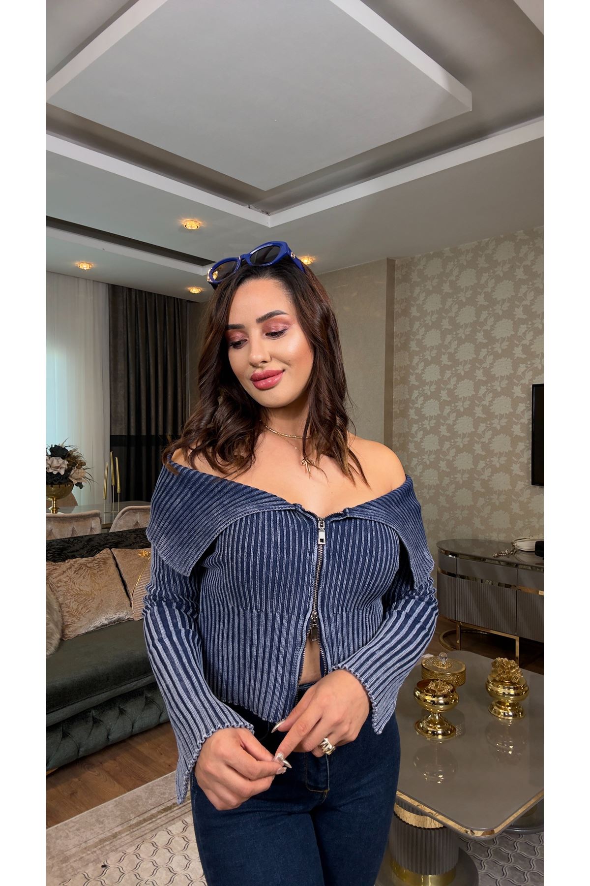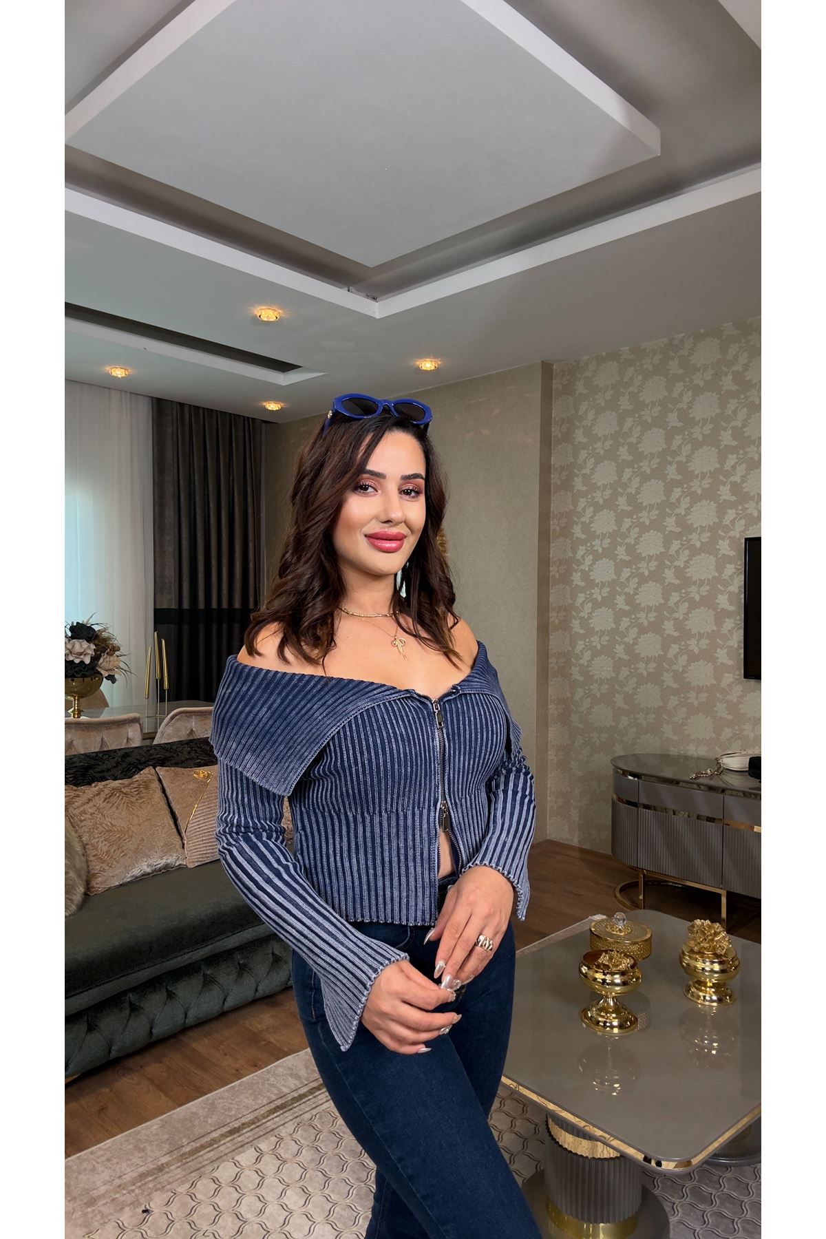 DİLVİN SOLUK EFEKTLİ KOL YIRTMAÇ DETAYLI FERMUARLI HIRKA-İNDİGO