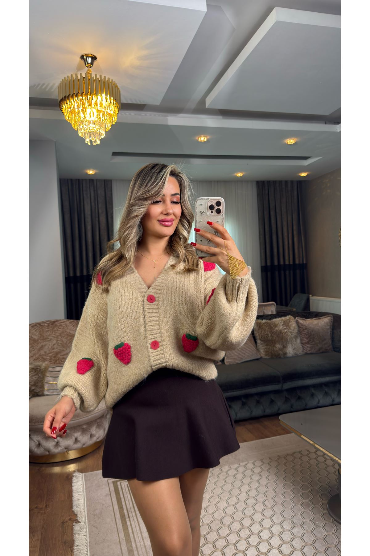 dilvin v yaka çilek nakışlı balon kol hırka-bej