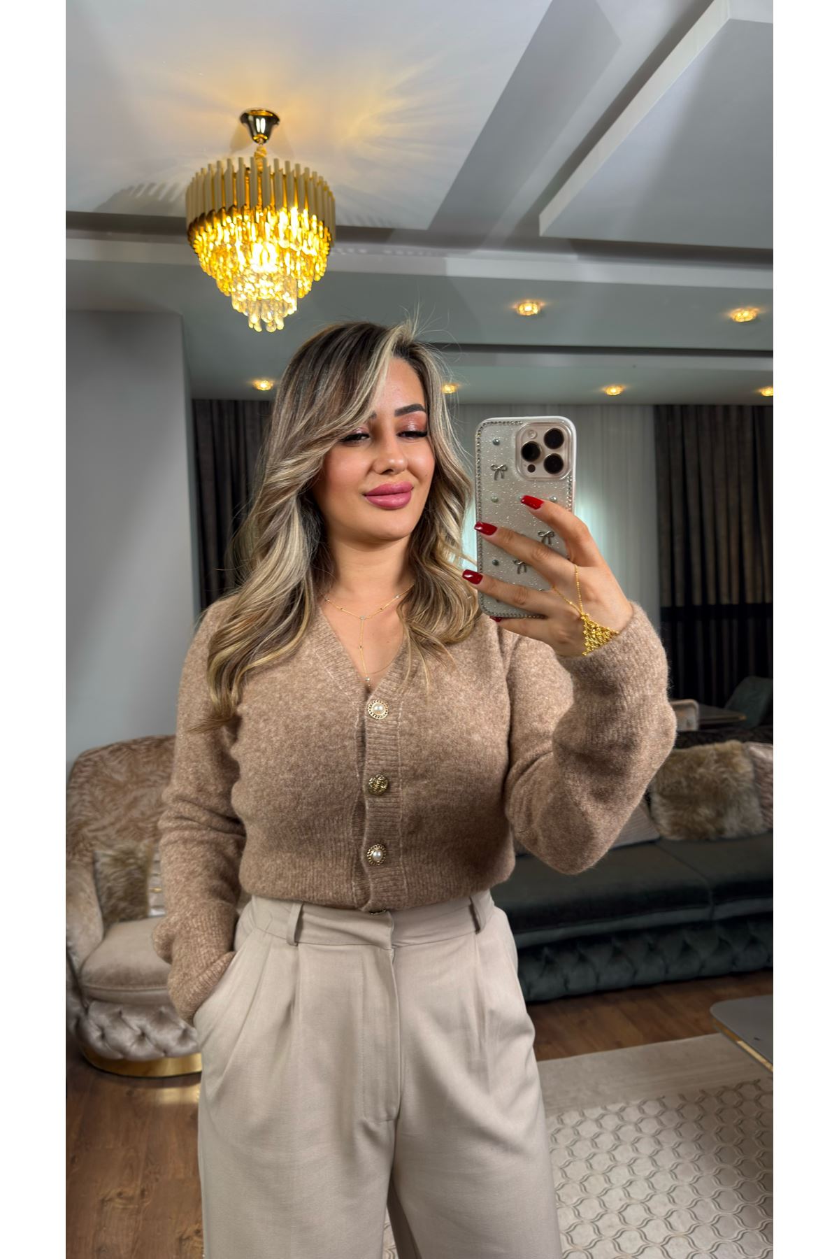 dilvin v yaka inci düğmeli triko hırka-vizon