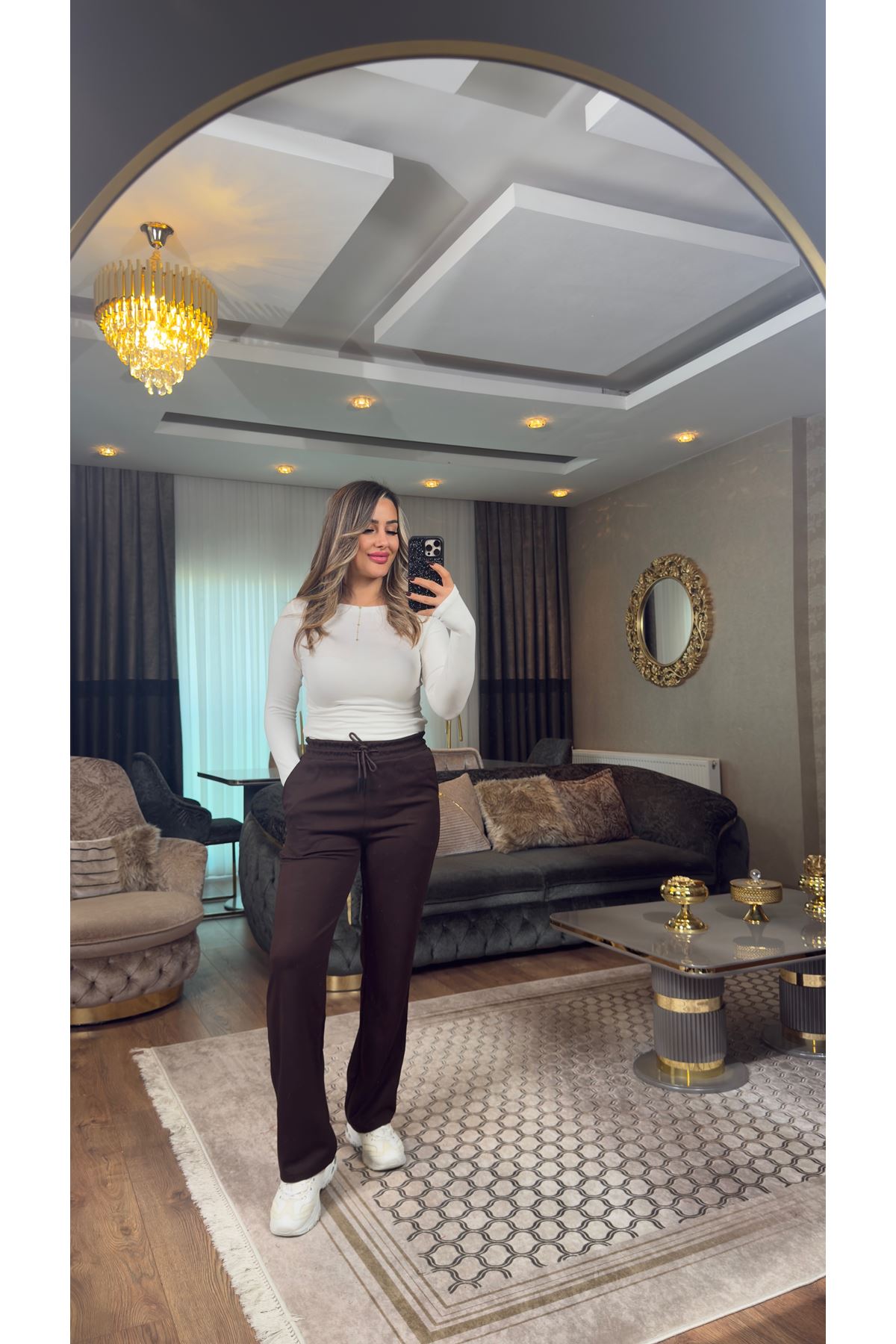 premium pamuklu palazzo cepli eşofman-acıkahve