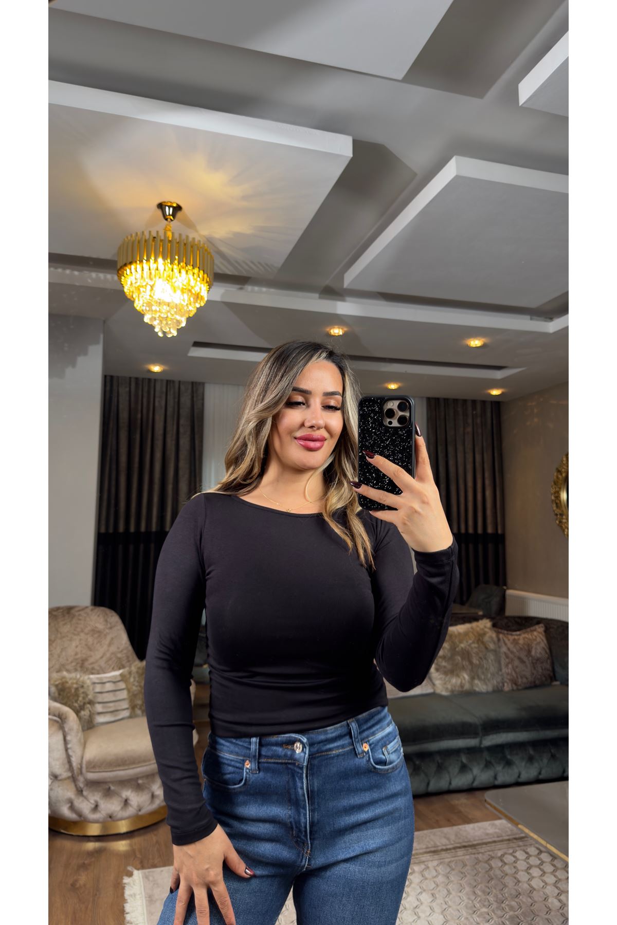 premium yanı büzgülü kayık yaka bluz-siyah