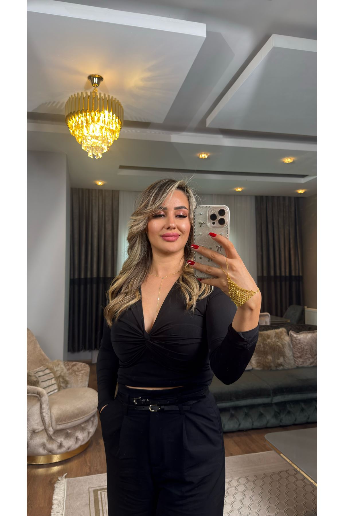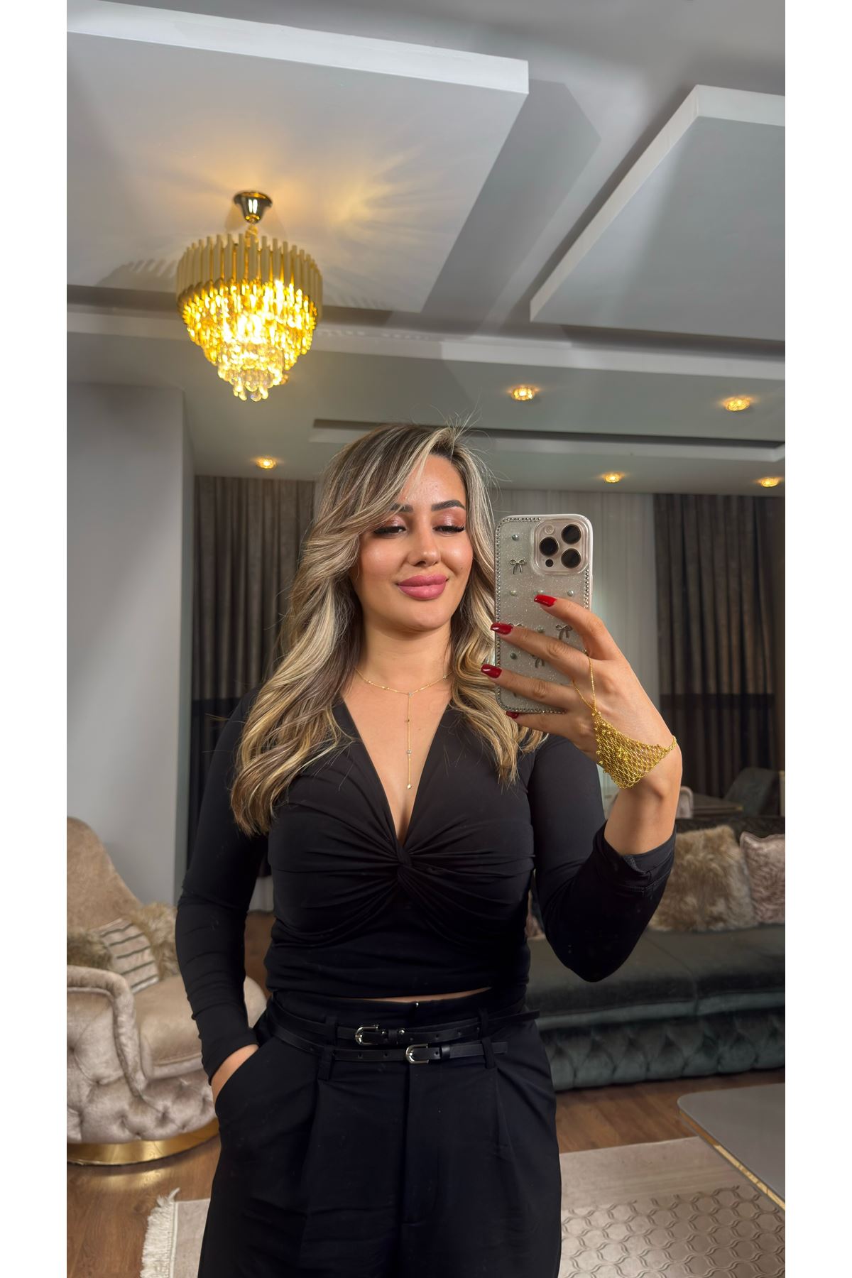 v yaka düğümlü bluz-siyah