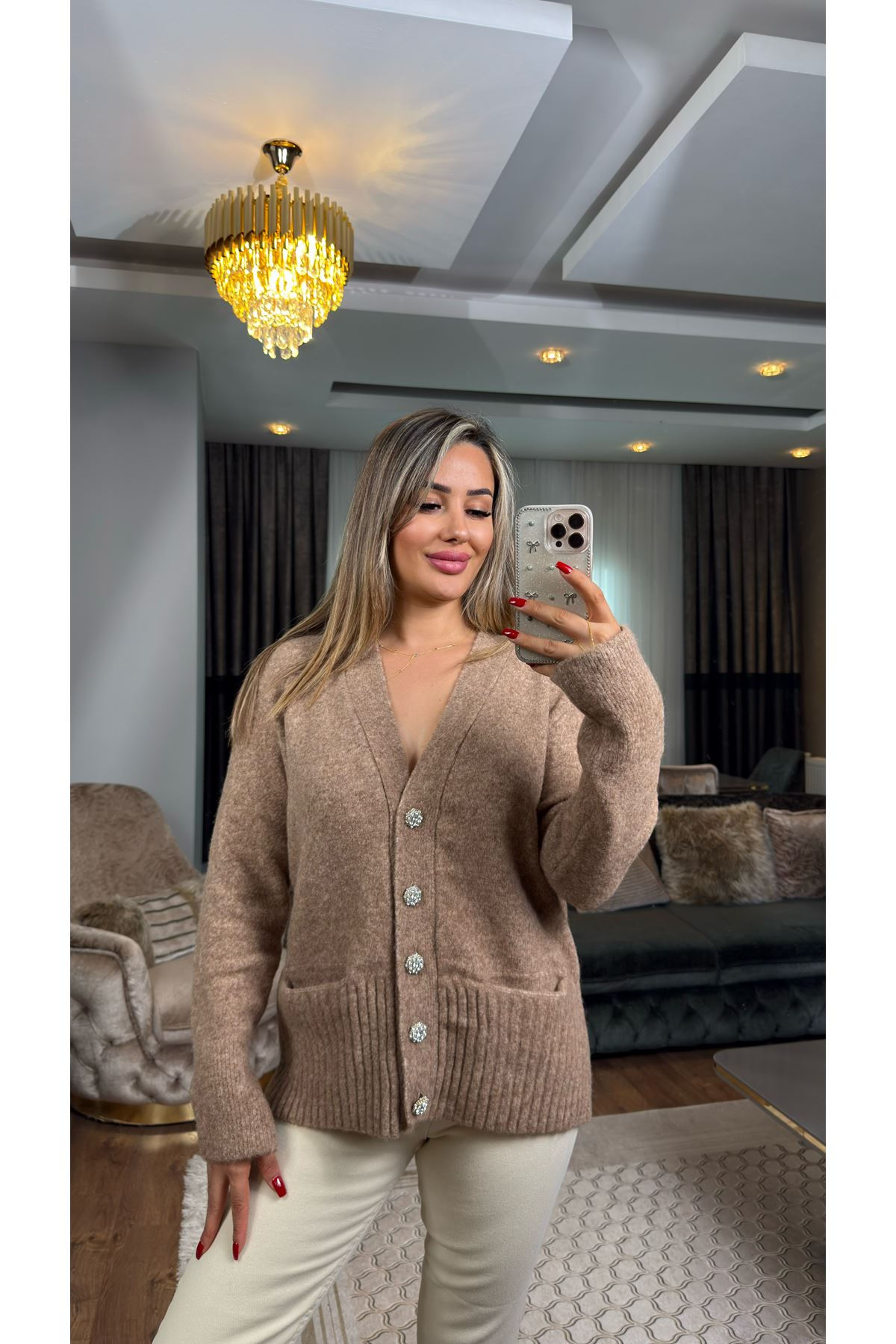 dilvin v yaka taş düğmeli cepli yumuşak dokulu triko hırka-vizon